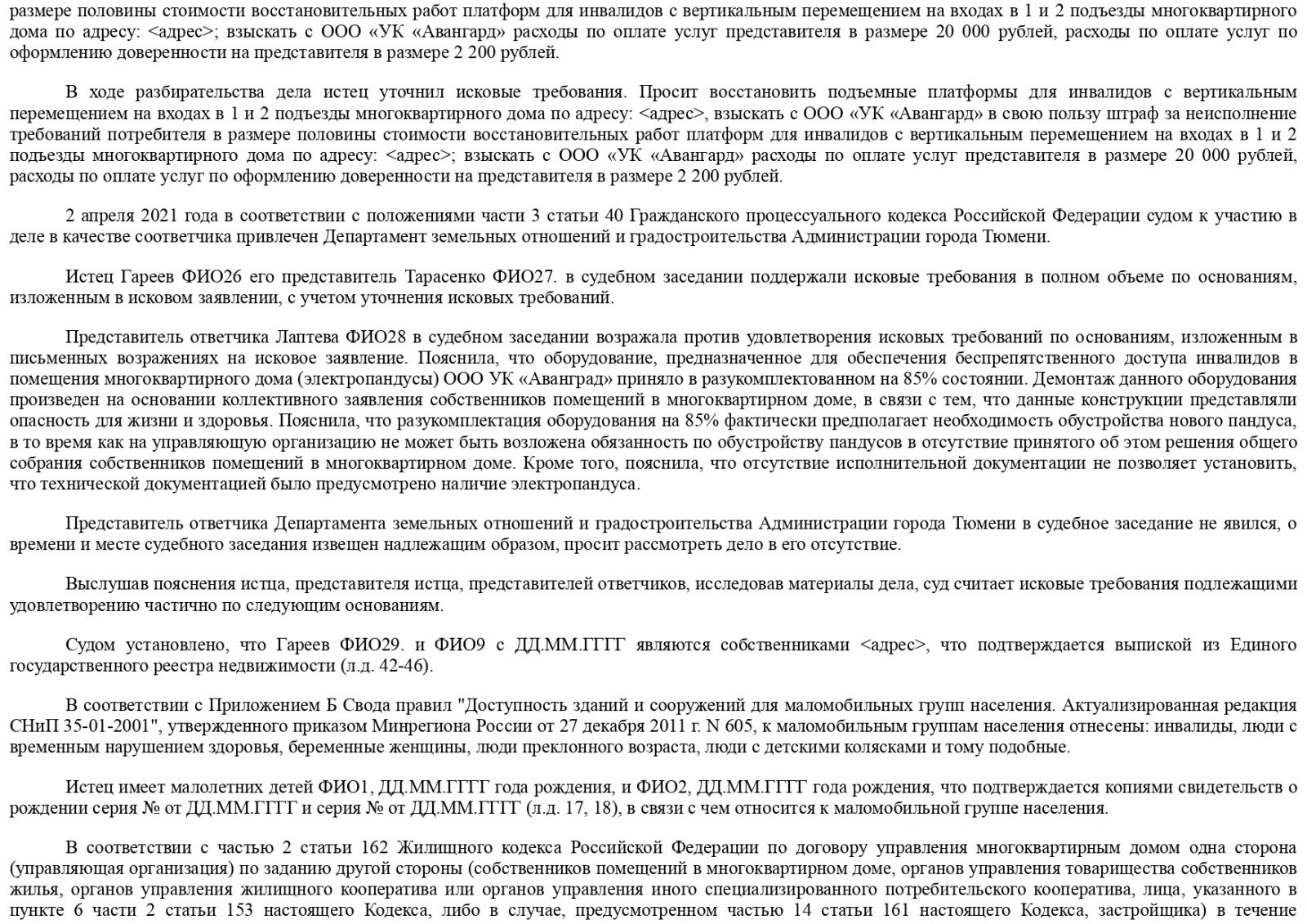 Управляющая компания демонтировала электропандусы для инвалидов возле подъездов жилого дома. В результате жильцы дома остались без пандусов и не могли даже поднять детскую коляску к двери подъезда. Через суд заставили управляющую компанию восстановить электропандусы.