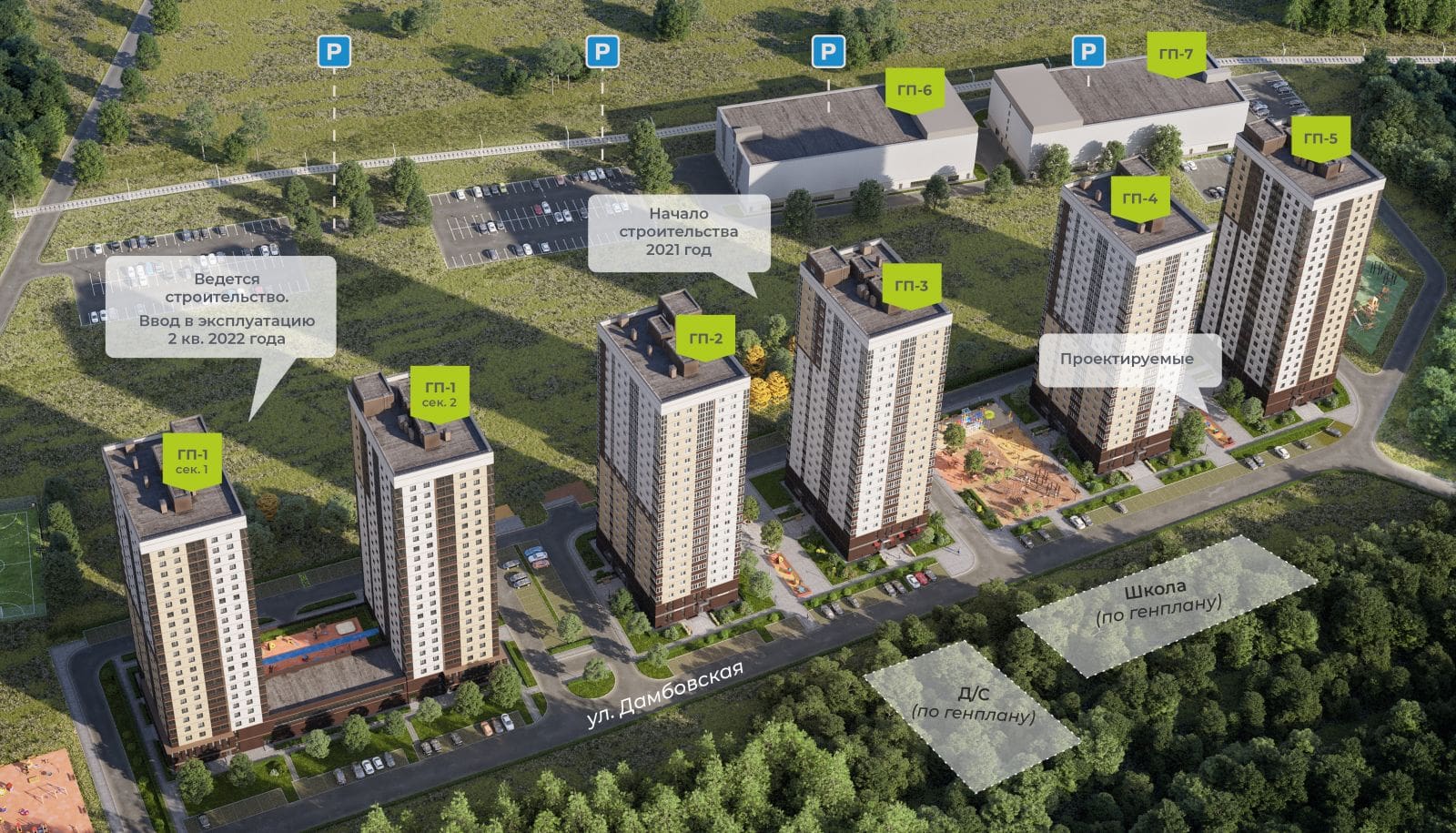 Жилой комплекс расположен в квадрате улиц Дамбовская, Барабинская и Судостроителей. На данный момент ведется строительство первой очереди ГП-1: двух 22-этажных домов с торговой галереей и многоуровневым паркингом. В ГП-1 секции 1 и 2 на уровне первого и второго этажей объединены торговой галерей. Жилые помещения располагаются с 3 по 22 этаж.